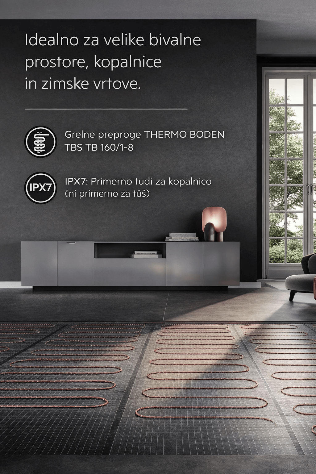 - Specifična moč: 160 W/m² – uravnoteženo in energijsko učinkovito ogrevanje